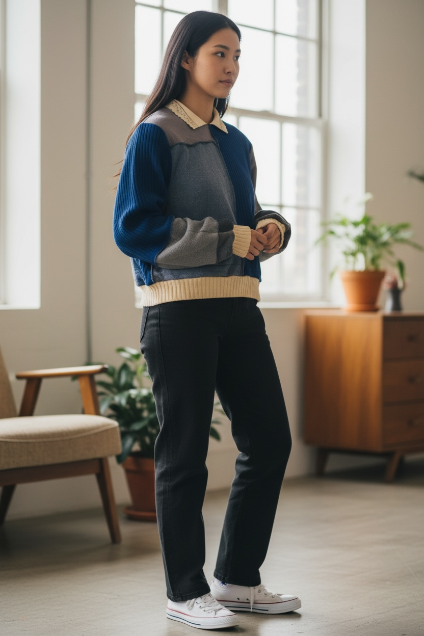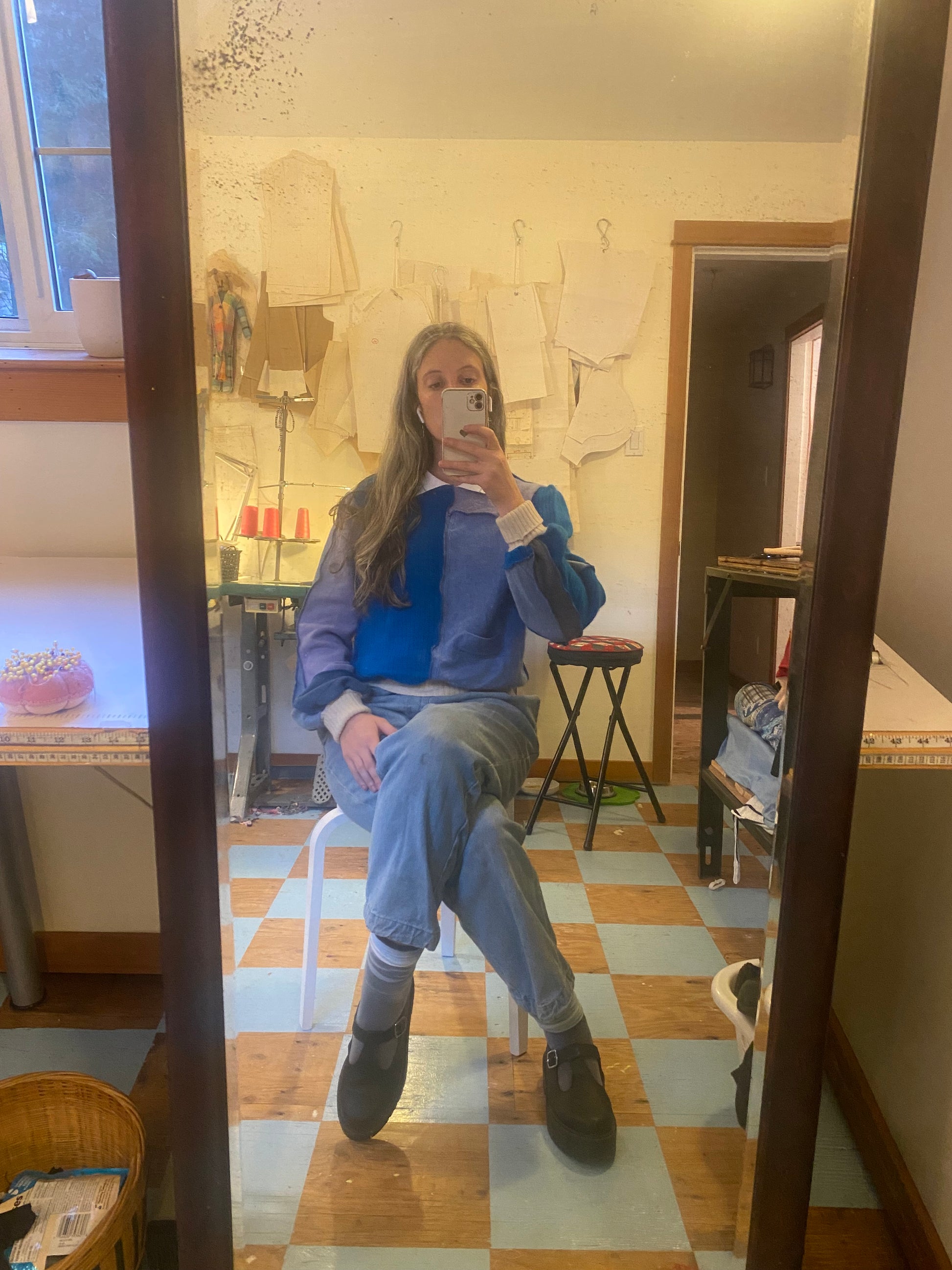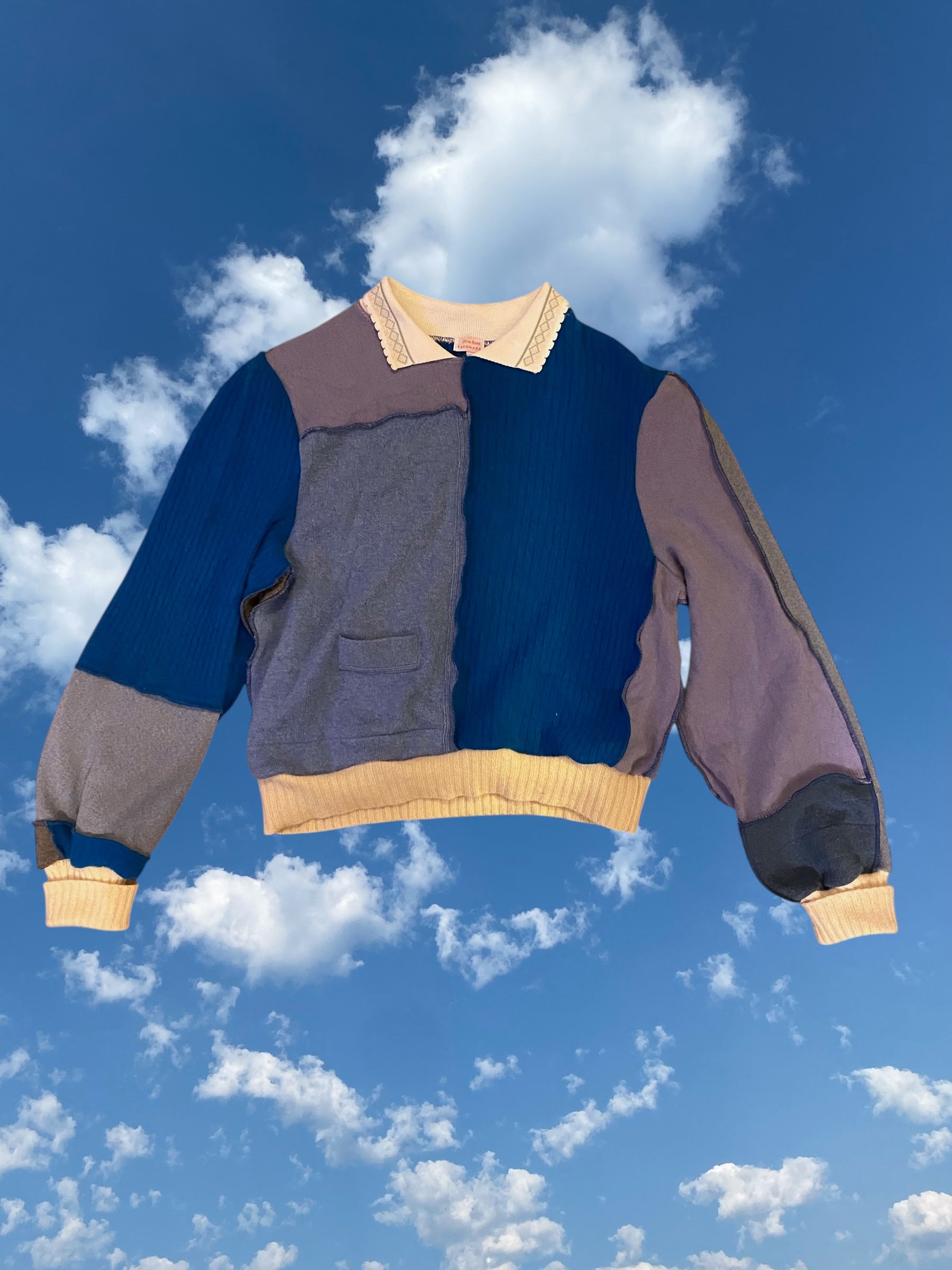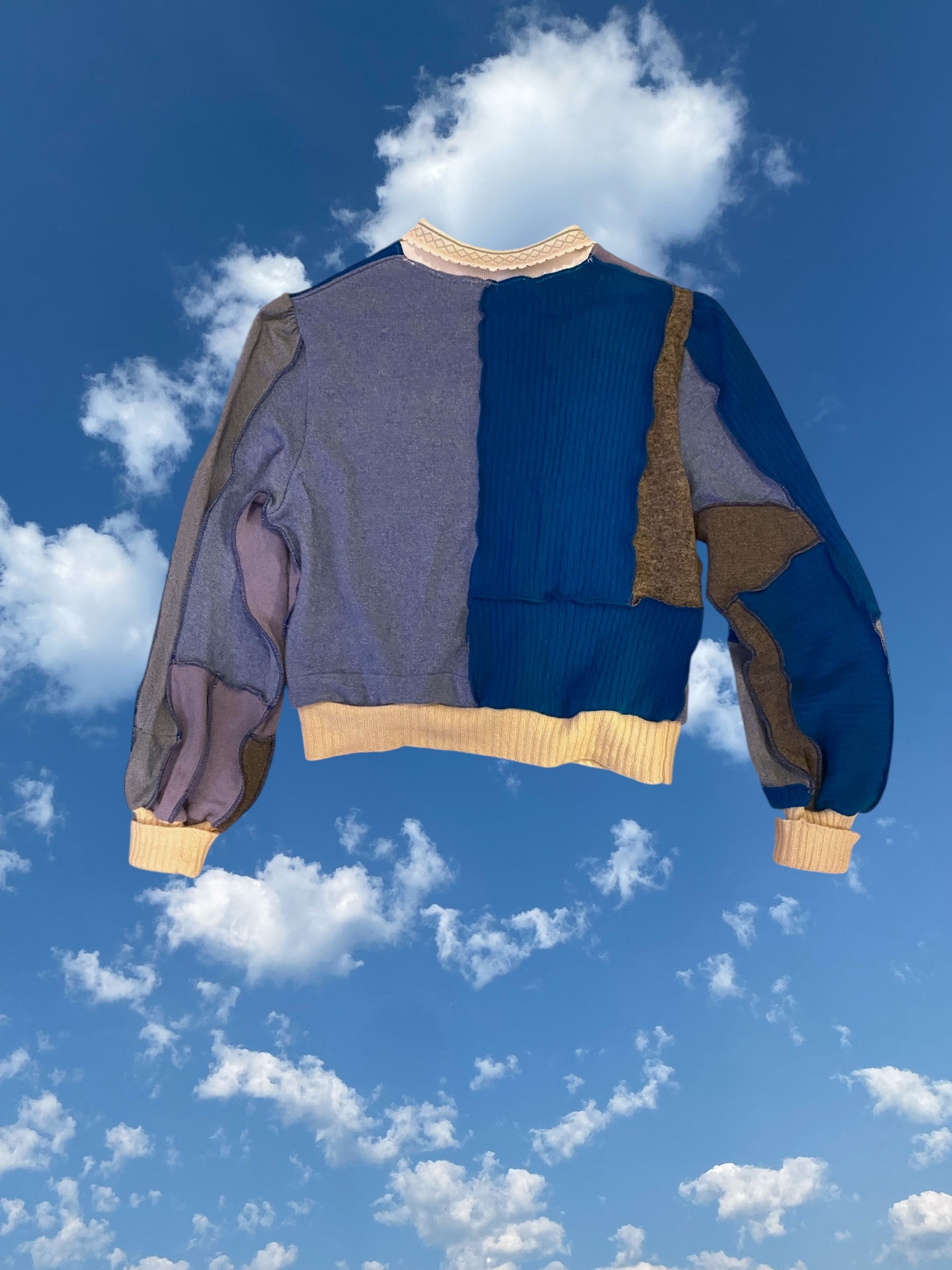 Each sweater comes together in a slow and intentional jigsaw puzzle process! And each one turns out completely one of a kind, and full of love and care. Has a slightly dropped shoulder for a roomy shoulder and armhole fit, and a slouchy long puffed sleeve. Sweaters are finished with recycled ribbing and collar.