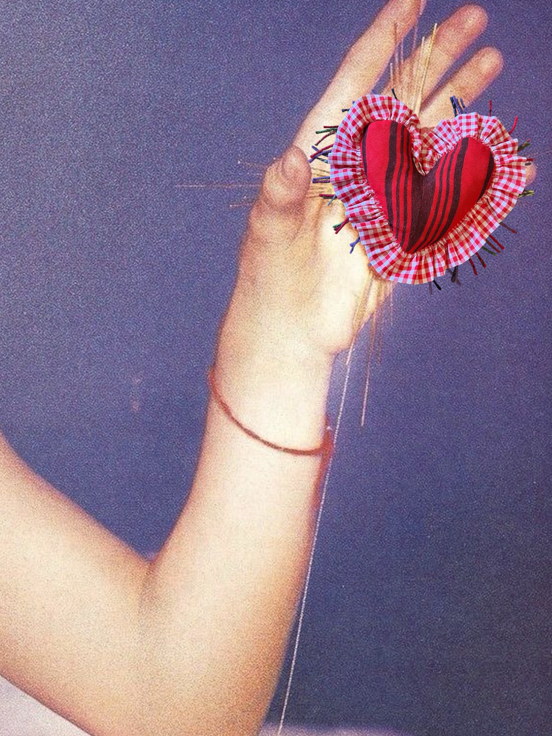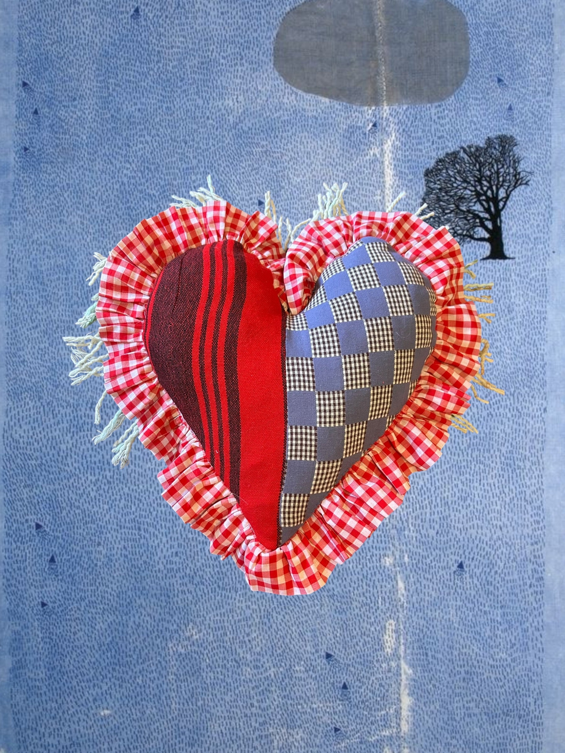 I made these patchwork heart cushions out of remnants of wool, cashmere, flannel, and soft cuddly materials, and stuffed them with scraps. Some feature fringe reclaimed from wool scarves. All have red gingham ruffle.