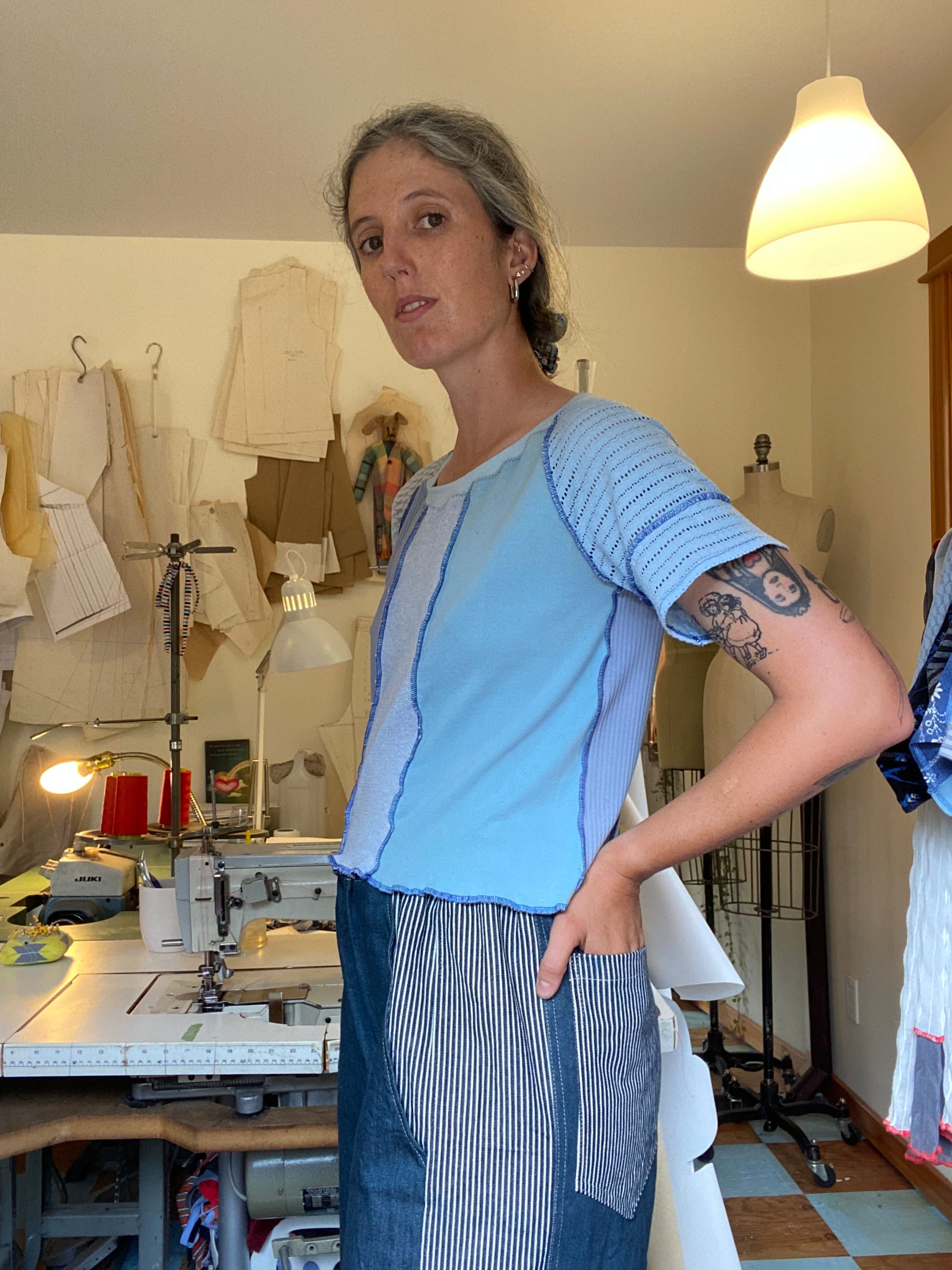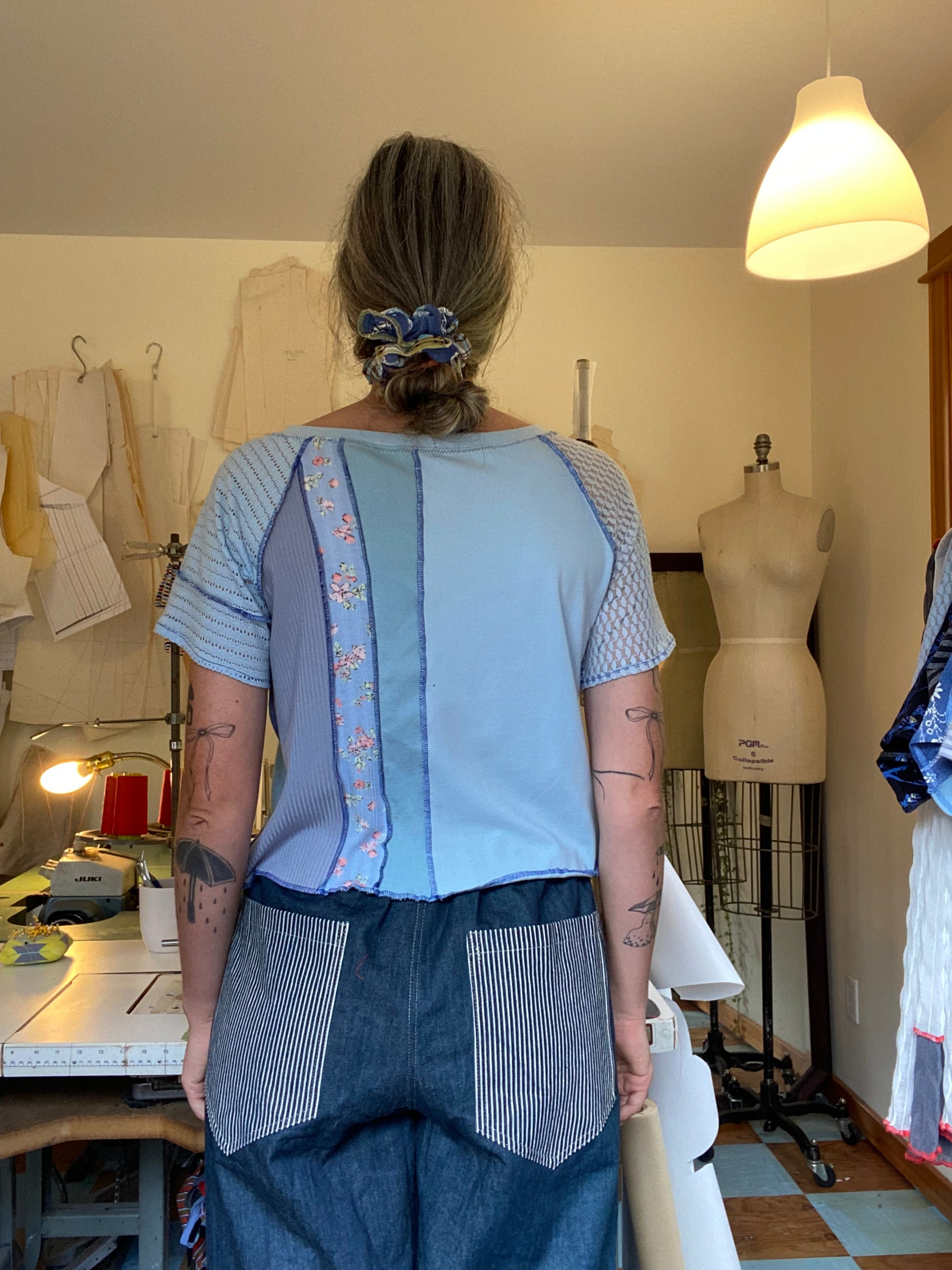A One-of One, Patchwork version of the raglan sleeve T-shirt. A frilly t-shirt with cute lettuce-edged details made from recycled vintage deadstock fabric. The playful details feature exposed rolled hem seams with contrast-color stitching and a fluttery edge along the sleeves, and hem. Fit is just slightly cropped.