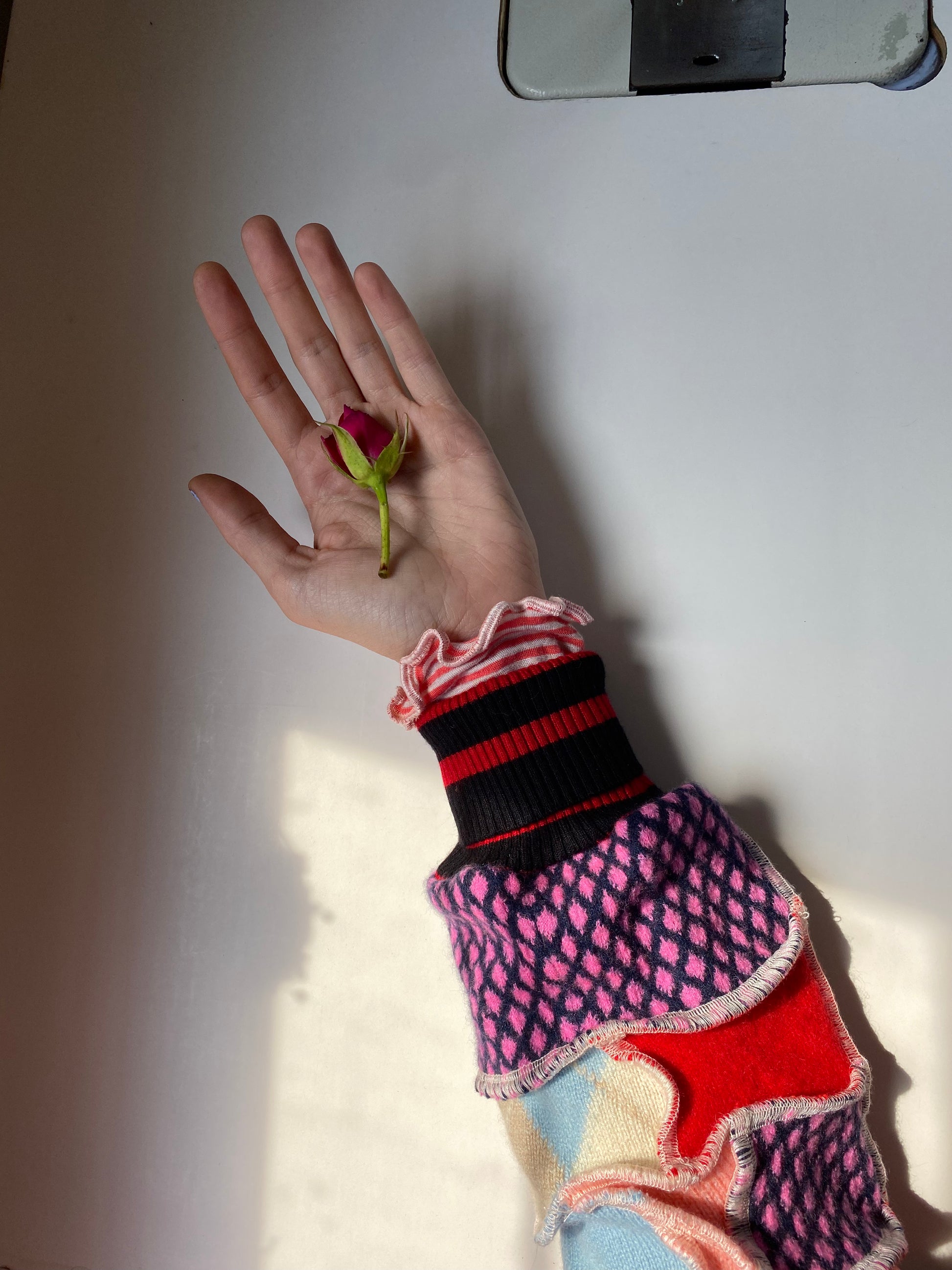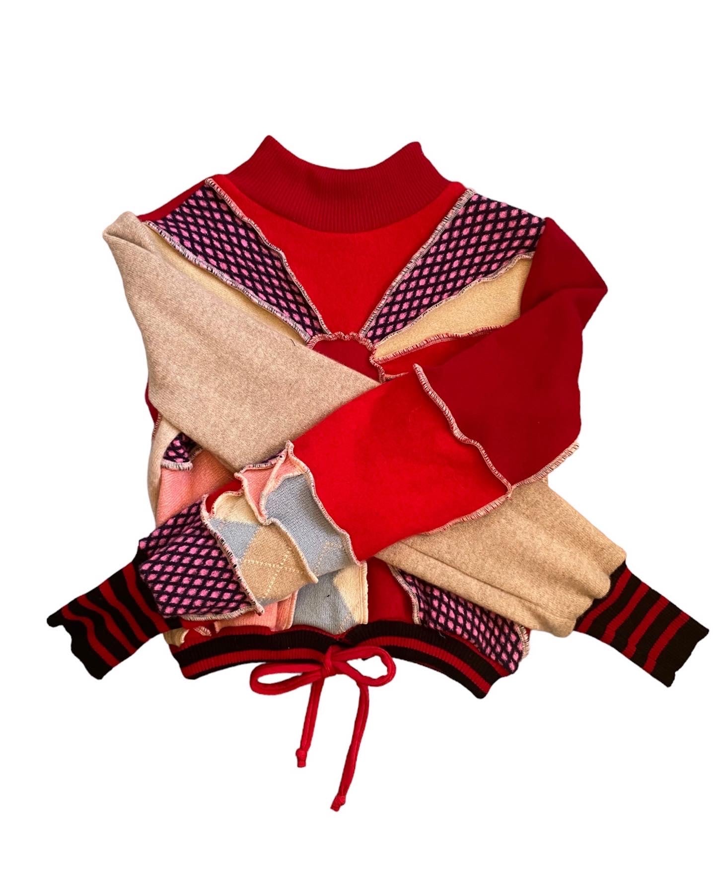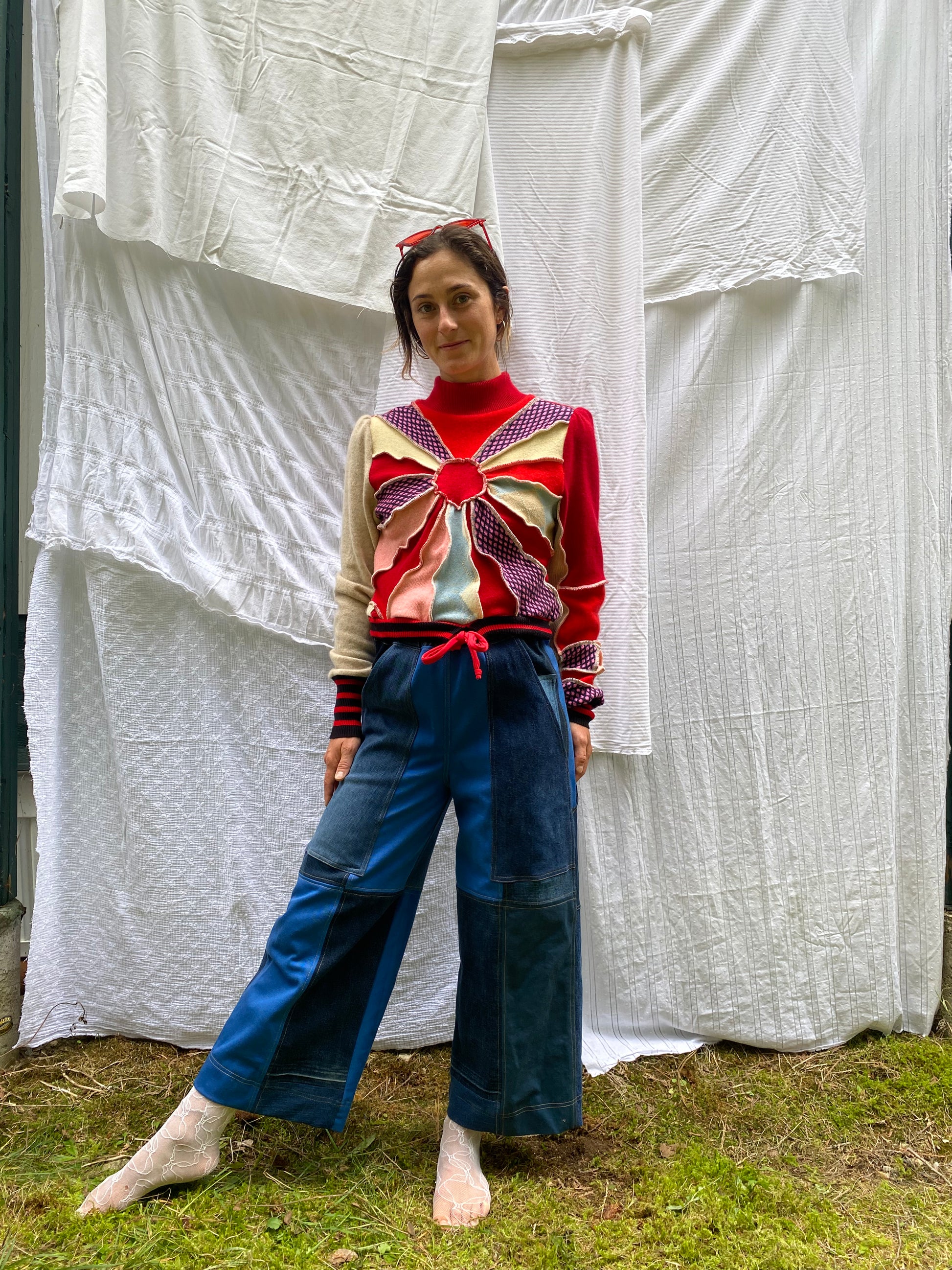 Each sweater comes together in a slow and intentional jigsaw puzzle process! And each one turns out completely one of a kind, and full of love and care. This slightly cropped version is great for wearing with high waisted skirts or jeans, or for layering. Has a slightly dropped shoulder for a roomy shoulder and armhole fit, and a slouchy long puffed sleeve. Sweaters are finished with recycled ribbing and collar.