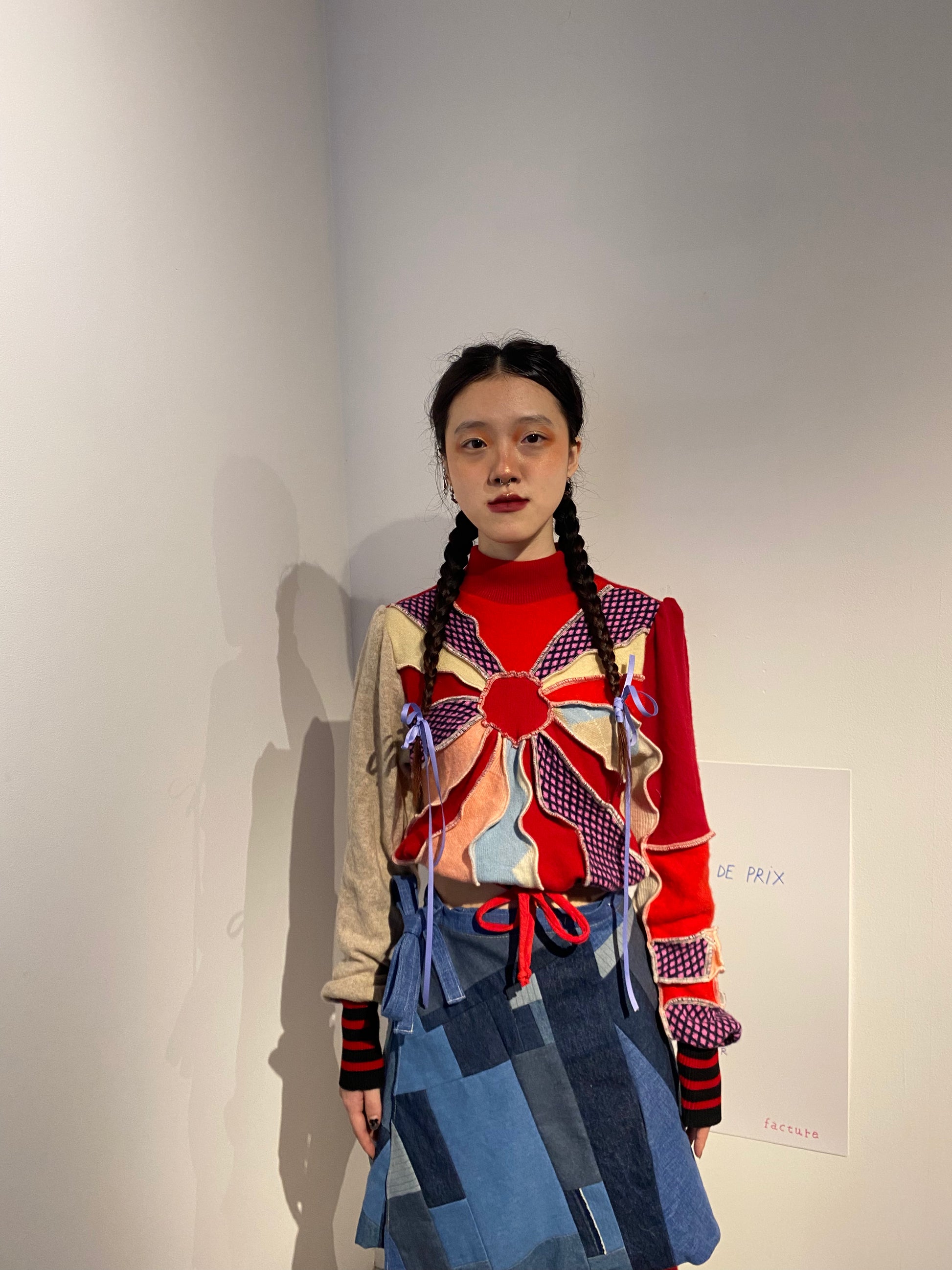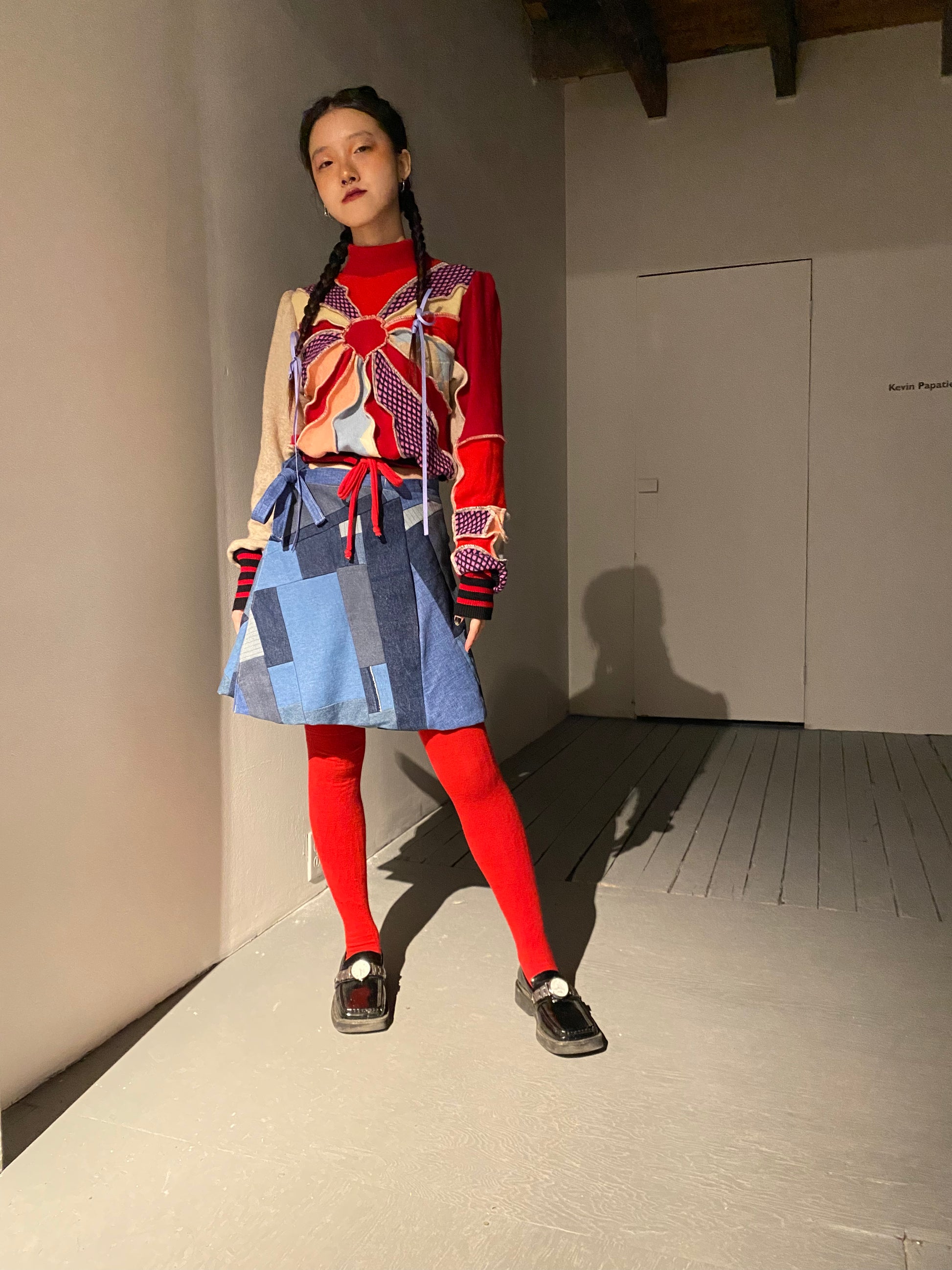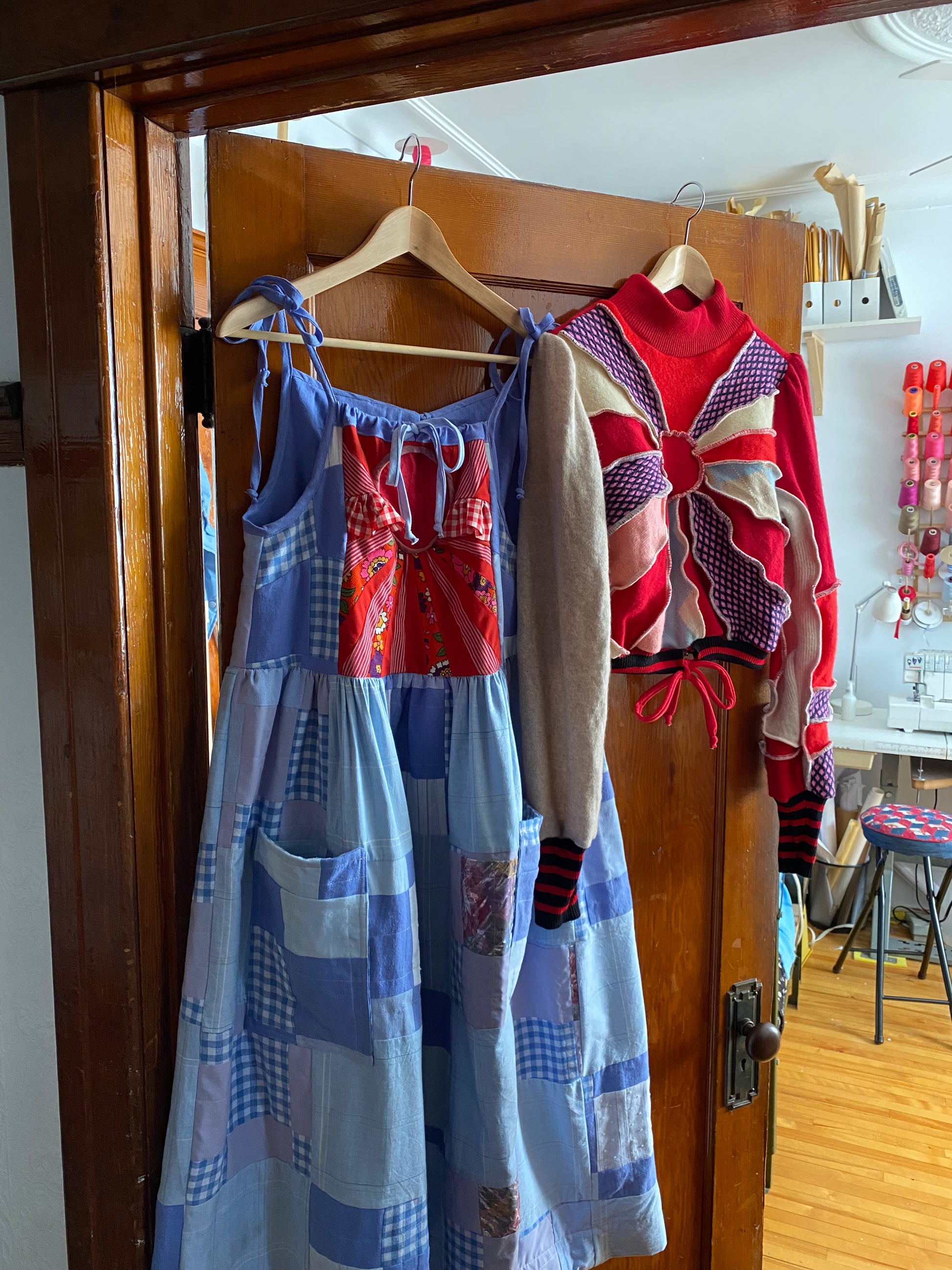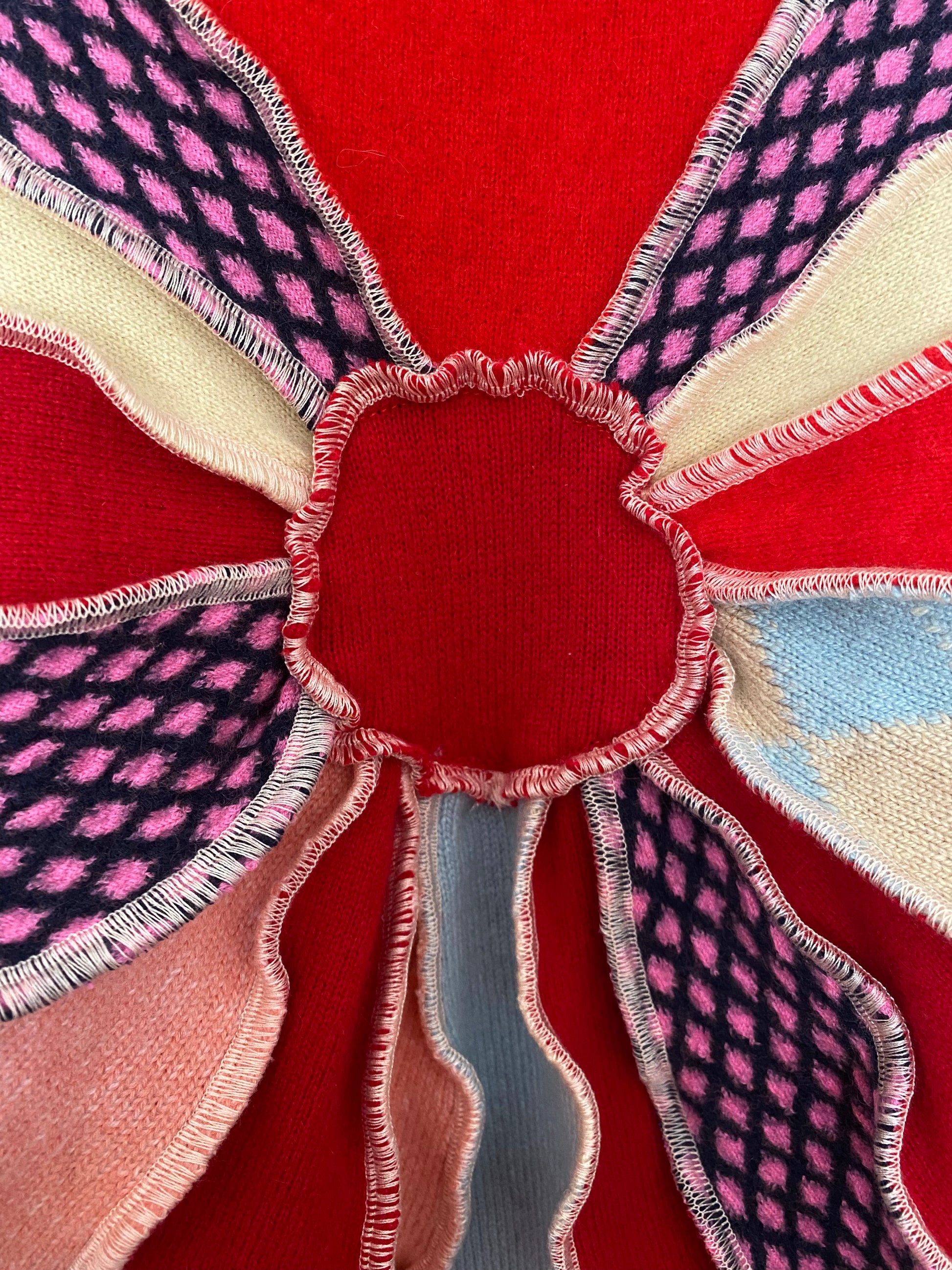 Each sweater comes together in a slow and intentional jigsaw puzzle process! And each one turns out completely one of a kind, and full of love and care. This slightly cropped version is great for wearing with high waisted skirts or jeans, or for layering. Has a slightly dropped shoulder for a roomy shoulder and armhole fit, and a slouchy long puffed sleeve. Sweaters are finished with recycled ribbing and collar.