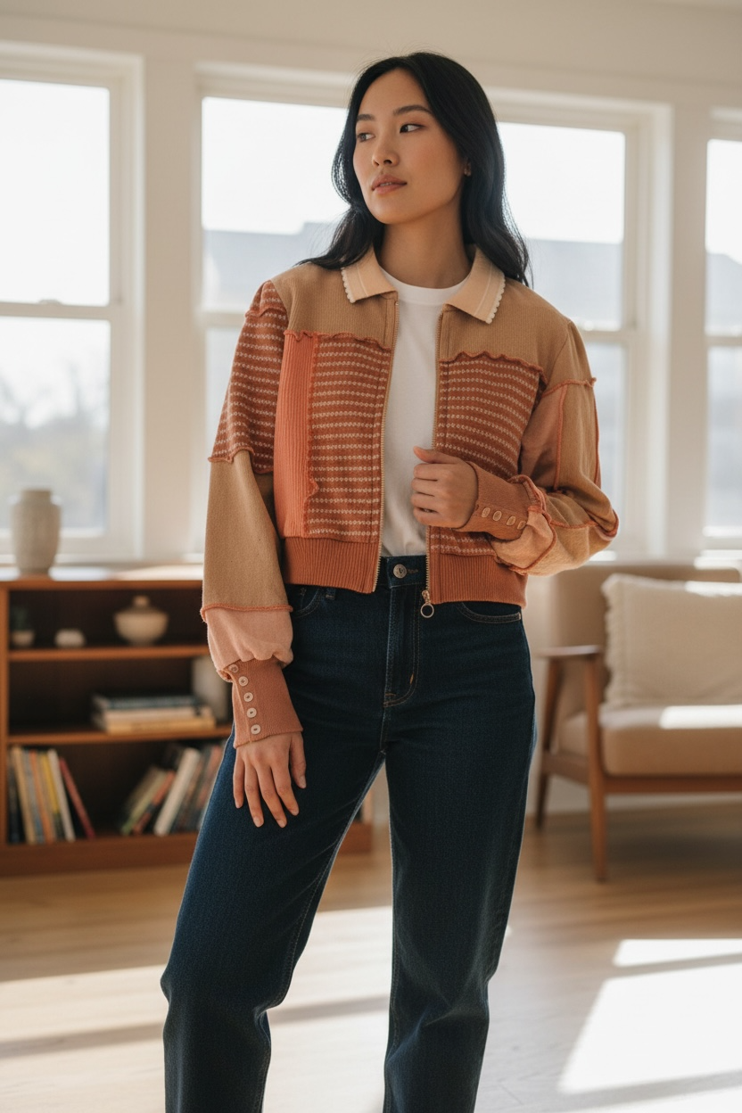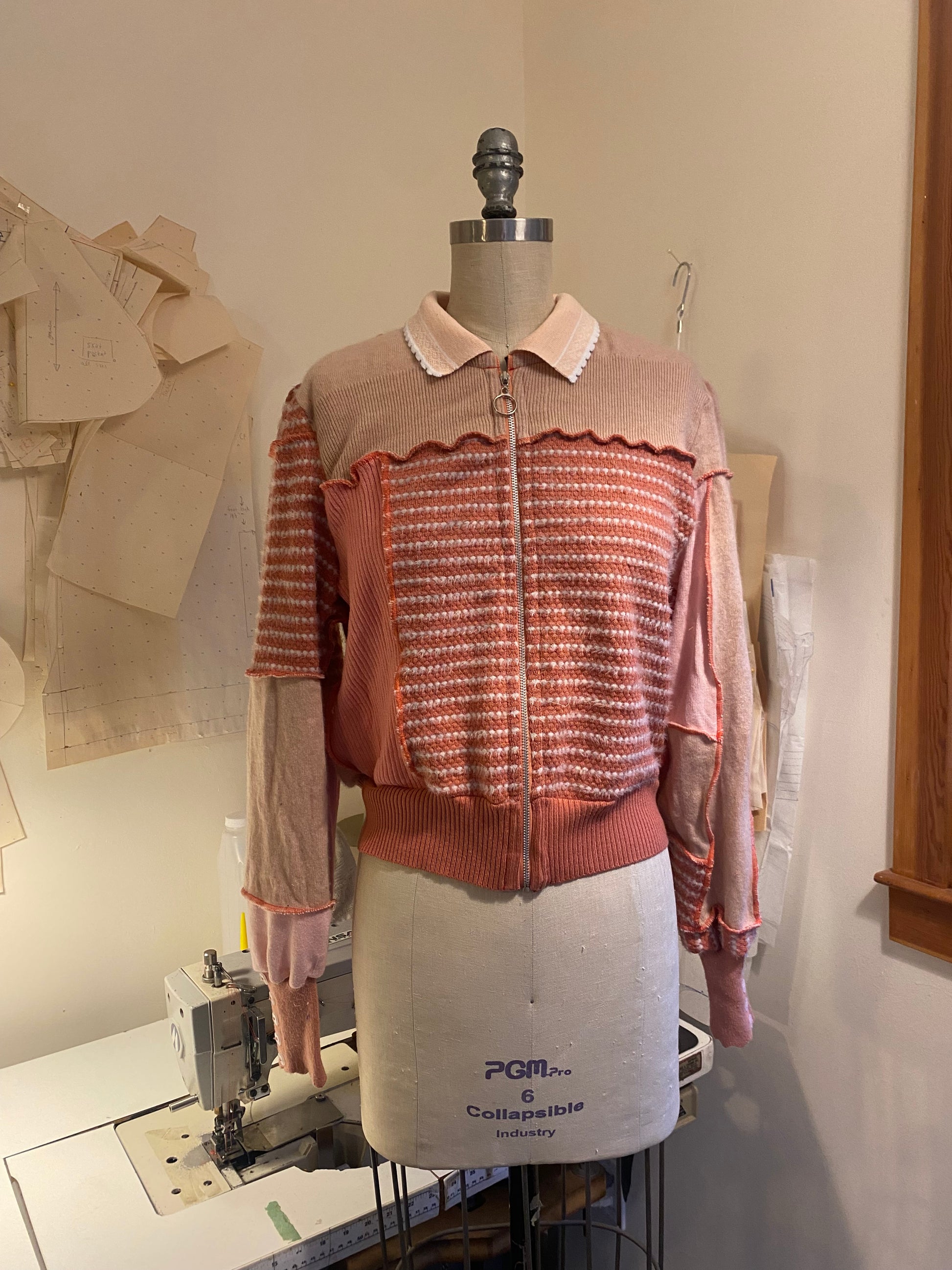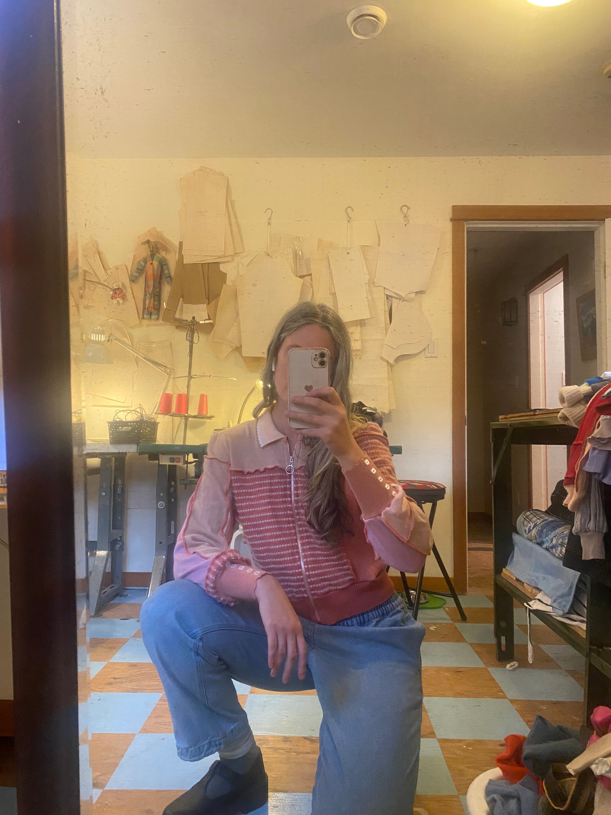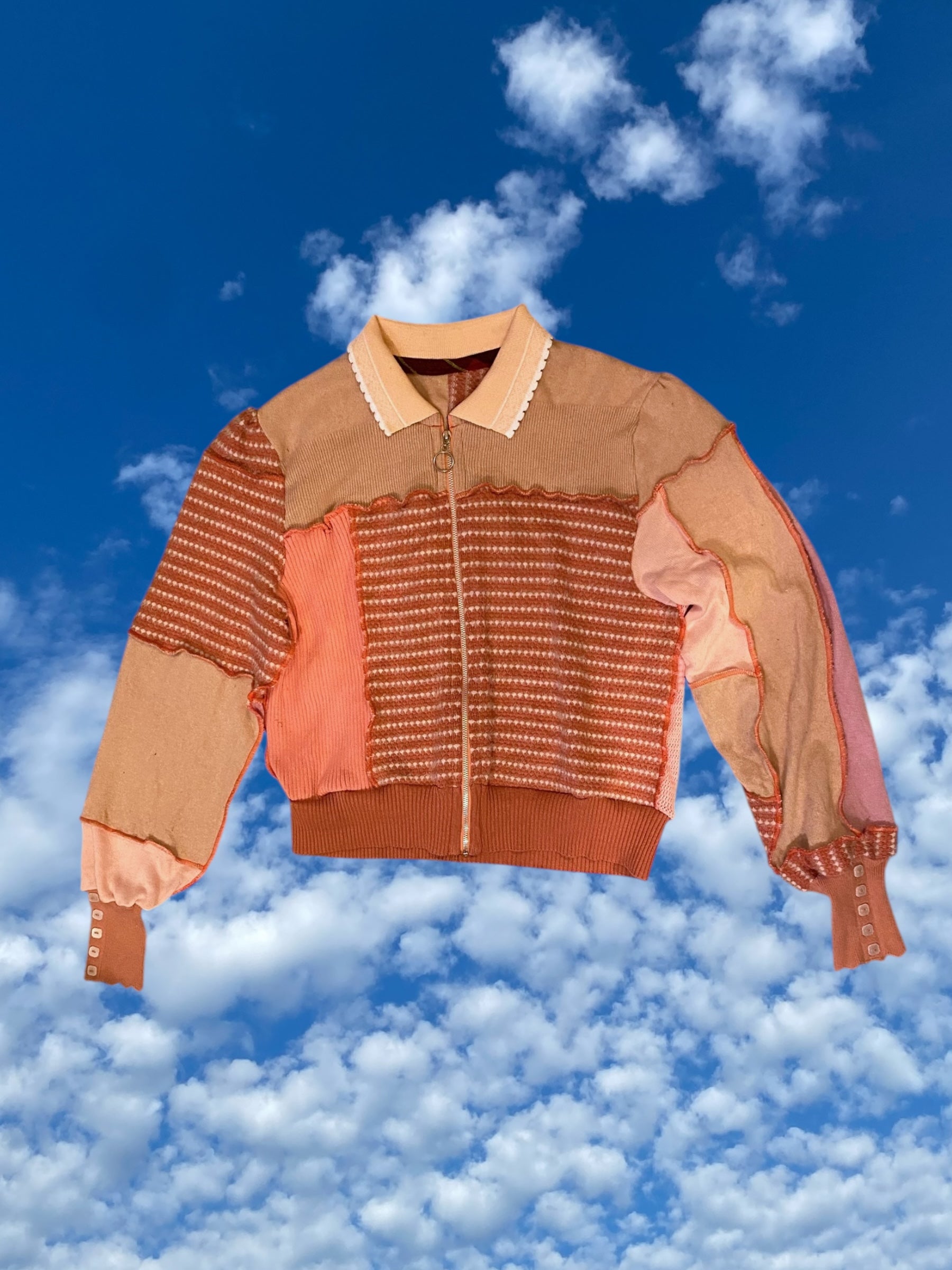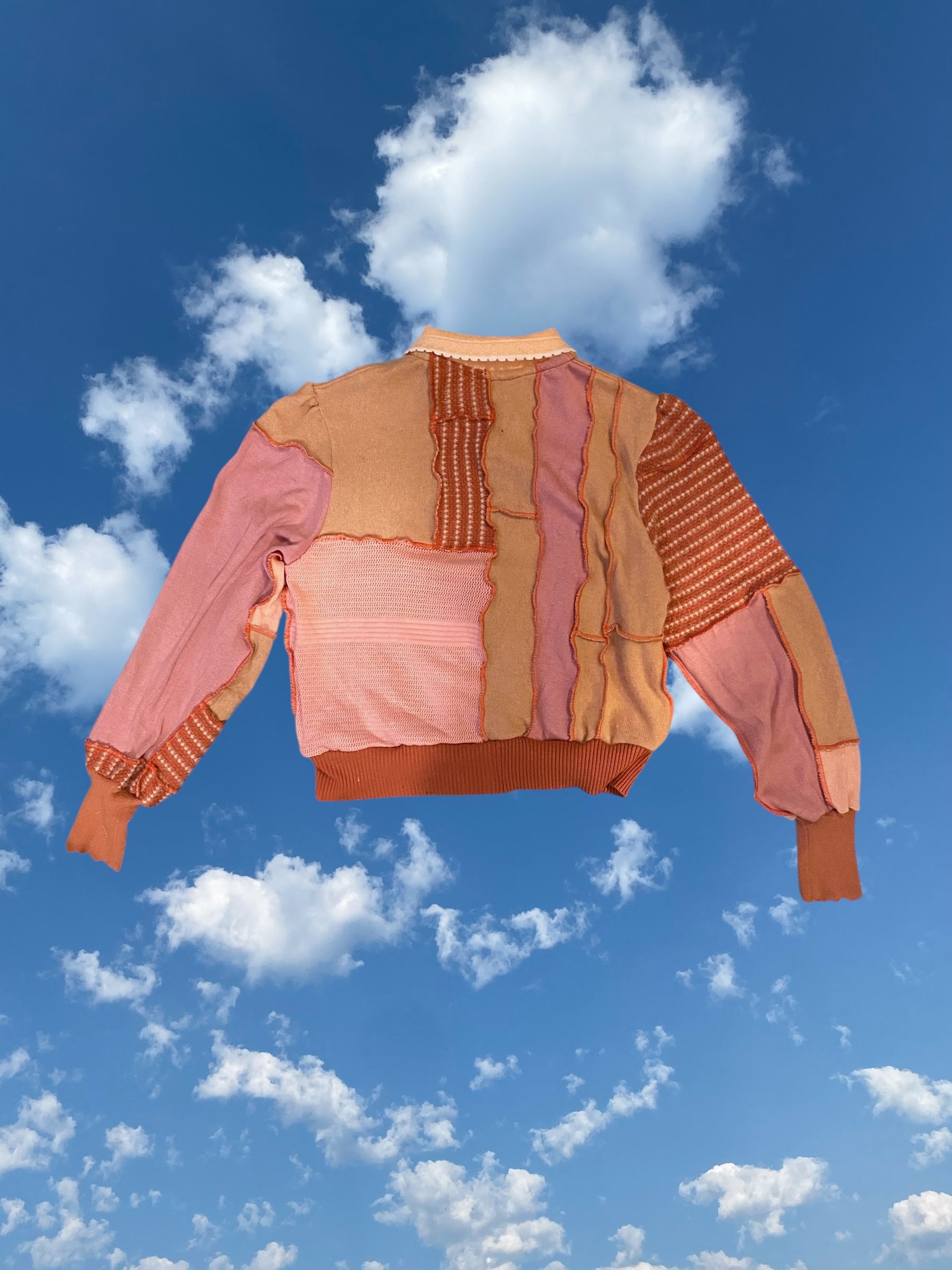 Each sweater comes together in a slow and intentional jigsaw puzzle process! And each one turns out completely one of a kind, and full of love and care. Has a slightly dropped shoulder for a roomy shoulder and armhole fit, and a slouchy long puffed sleeve. Sweaters are finished with recycled ribbing and collar.
