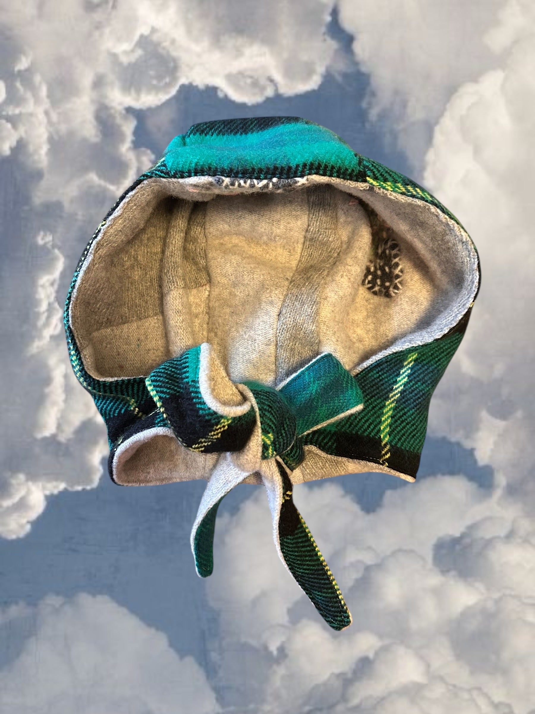 The winter bonnet is extra cozy & soft , and fully reversible (turn it inside out if you want the coziest side on the inside!) It has a generous size for layering and ties at the chin that you can wear many ways: long, wrapped around, or in a bow.